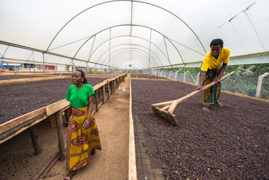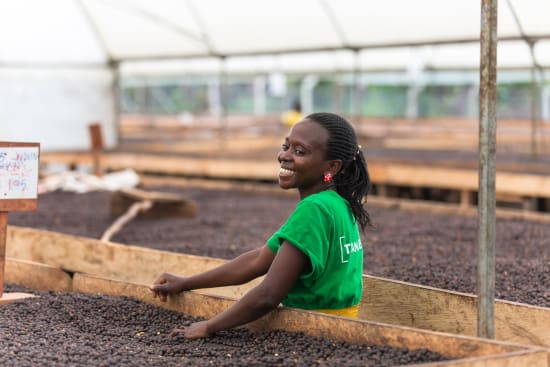 The cherries are selectively picked and brought to the processing station on the same day. It is then separated by floatation and put onto drying tables. The coffee is then dried for 21 to 35 days. Once it is ready, the dried cherries are then brought to Kampala for milling and export processing.